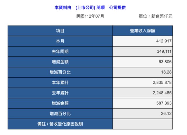 標題[情報] 9942 茂順 112年H1 eps5.91 及7月營收