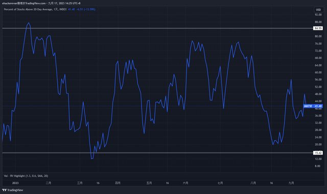 2. 股價站上50MA比例從七月後一路下滑