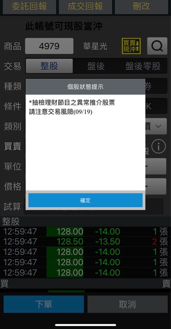 是這樣的啦, 股市兩大老師分別有各自必勝法門, 第一是對折的35法則, 第二+~的一追突破,二買拉回,三接跌停 今天剛好就有一檔華星光同時滿足兩位老輸的條件 可要下單時就發現被示警成理財節目之異常推介股 有人知道這是什麼嗎? 另外要達成什麼條件才能被這樣示警 https://i.imgur.com/pqqRwhq.jpg