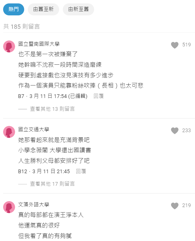 推 hjkkk123: 我不會特別想看她演的戲,感覺一般般,不過幾乎都女的在罵 03/26 15:10