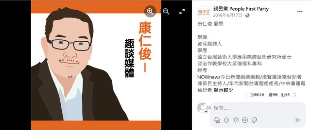名嘴康仁俊過去曾擔任親民黨顧問、代表親民黨參選立委落選