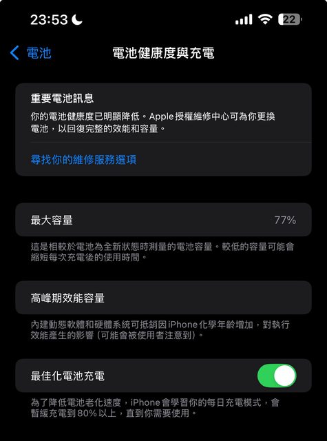 物品狀況:有貼螢幕保護貼、鏡頭保護貼,使用上均有手機殼。電池健康度77%