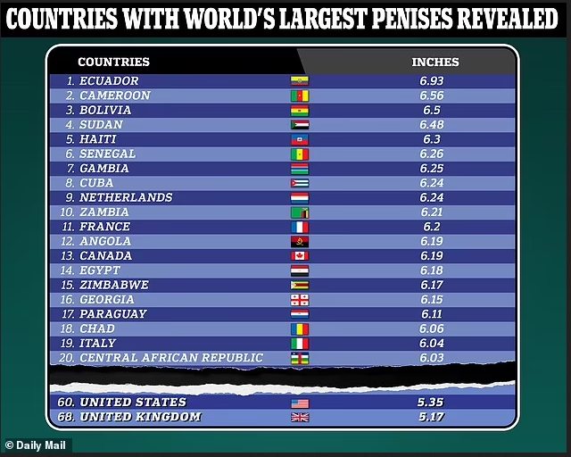 : ▼全球男性陰莖平均長度,南美國家厄瓜多平均17.61公分居冠。(翻攝自@DailyMailAU