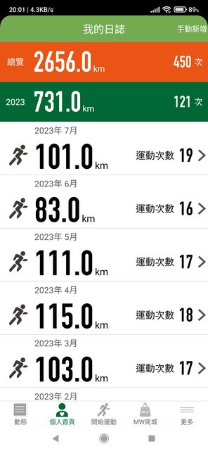 8.雖然跑得不快,但很喜歡慢跑,月跑量100km多一點。