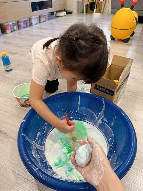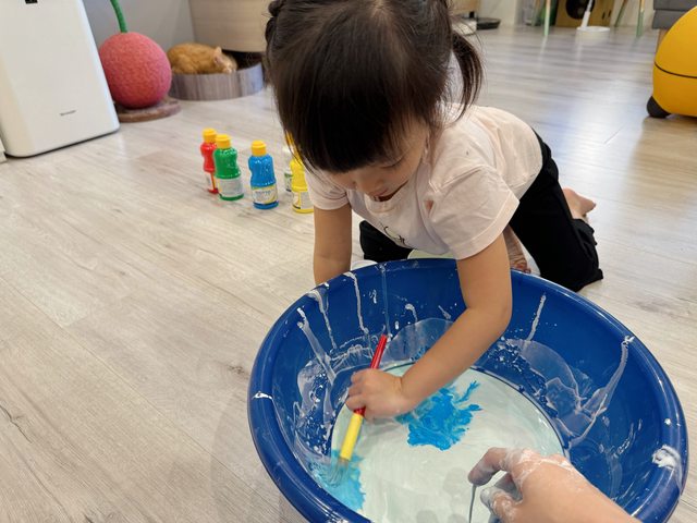 我們準備了水彩顏料讓她玩顏色