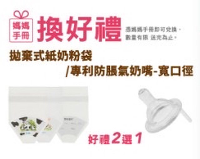 憑媽媽手冊可以換拋棄式紙奶粉袋/專利防脹氣奶嘴2選1