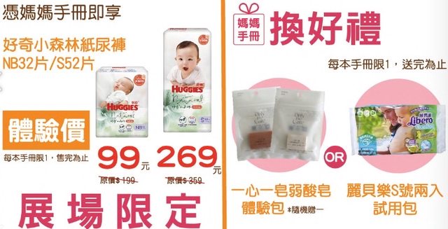 憑媽媽手冊可以兌換一心一皂弱酸皂體驗包或是麗貝樂S號2入試用包