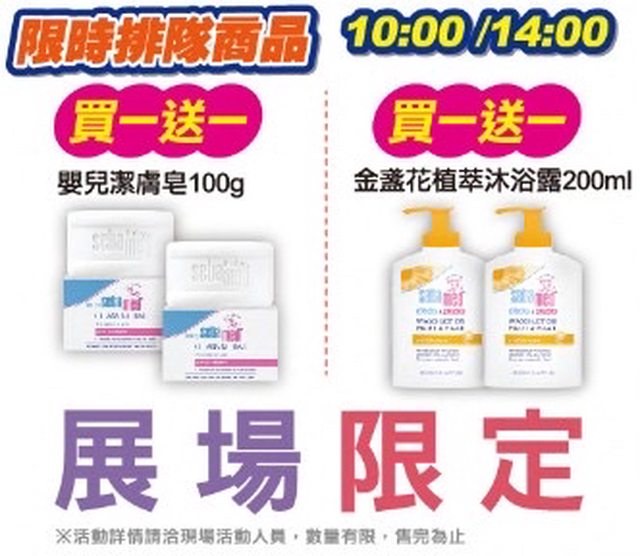 每天10:00和14:00展場限定嬰兒潔膚皂和金盞花植萃沐浴露有買一送一優惠