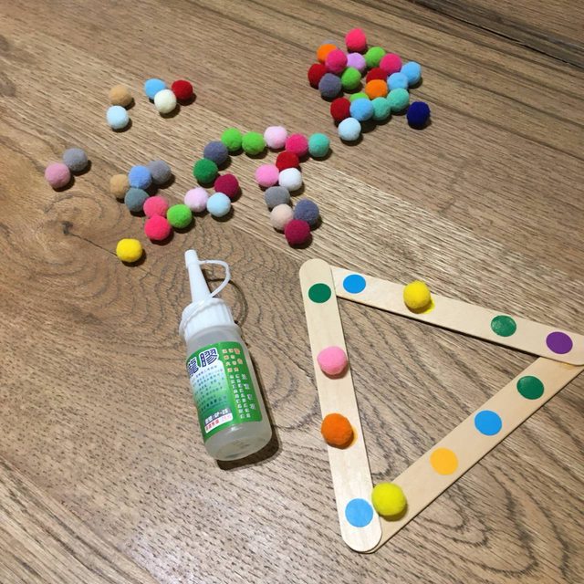 冰棒棍黏成三角形後,先貼上彩色圓點貼,