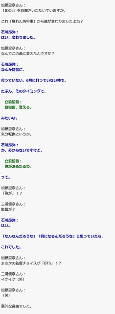 主持:沒想到是監督選的BTS!?(笑) 出乎意料的選曲。