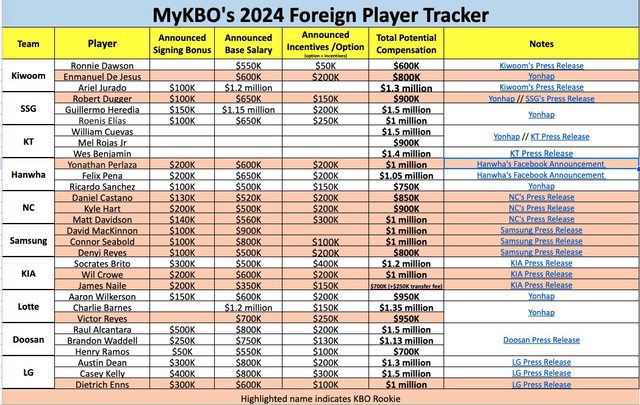 標題[分享] 2024 韓職十隊洋將名單&薪資&前一年成績
