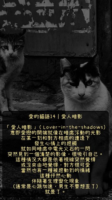 愛的貓語系列,運用短文說愛情(希望利用一些短句描述愛情的質地,或許可為某些人思考參考),來到愛情發生的原初描述,不是符合你意識上的設定條件,它是一種「打動」,你不知道為什麼?