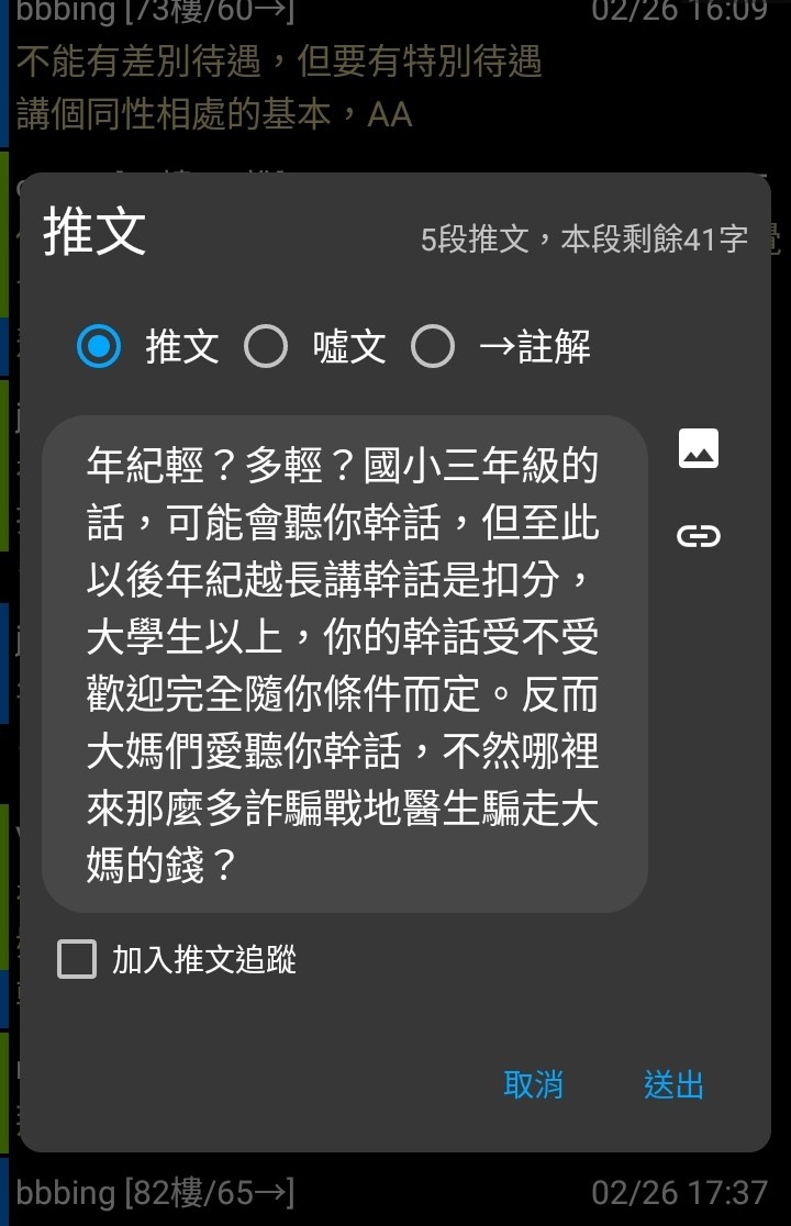 推 jennyfish102: 看女生年紀,年紀愈長的女生,愈覺得講幹話是扣分, 02/26 16:34