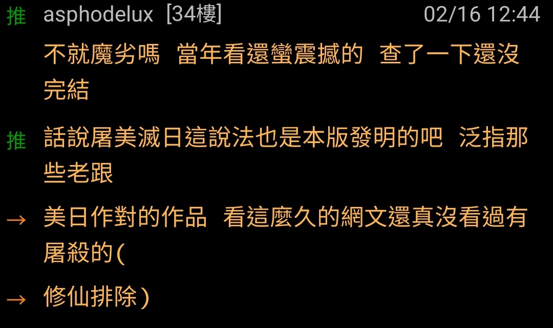 → asphodelux : 美日作對的作品 看這麼久的網文還真沒看過有屠殺的(02/16 12:50