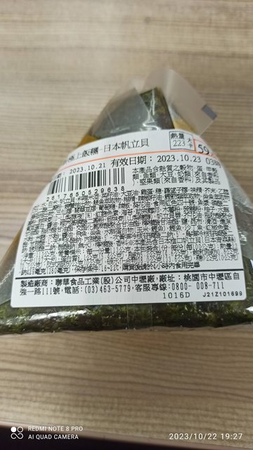 【規格/內容物/熱量】:御飯糰/飯、海鮮/223大卡