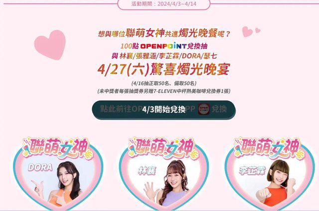 會員於OPENPOINT APP上可使用100點OPENPOINT兌換1張數位「聯萌女神驚喜燭光晚宴抽獎