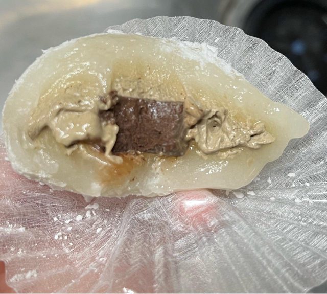 外面的麻糬皮蠻厚的,不過沒有因為冰在冰箱裡面變硬,咬下去第一口是充滿觀音茶香的