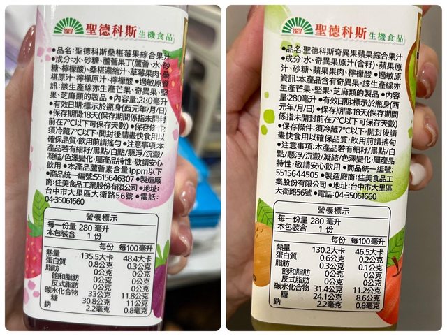 【商品名稱/價格】:聖德科斯綜合果汁-桑葚莓果汁&奇異果蘋果汁/45元