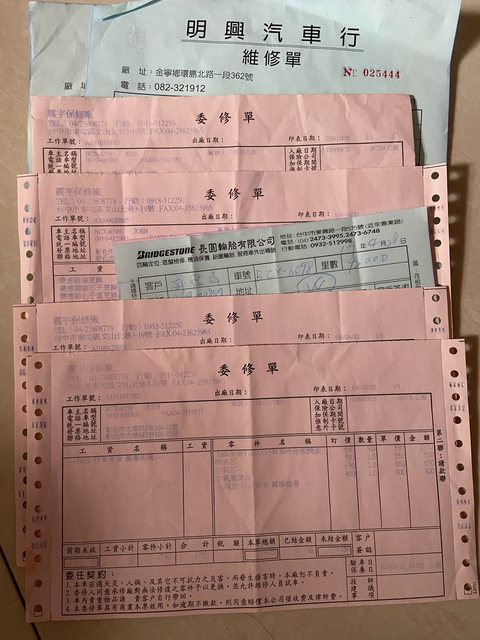 維修的清單內容:基本換油保養,四顆輪胎更換+定位,4組高壓線圈、輪速感知器、電瓶、變速箱油 等等的