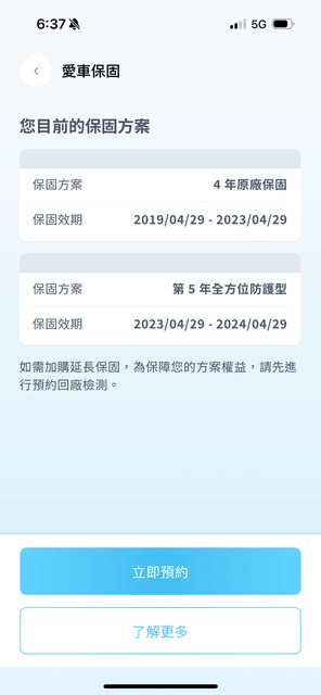 2. 全車五年保固到2024/4/29,只是現在第五年,是當初購車贈送的全方位防護型保固
