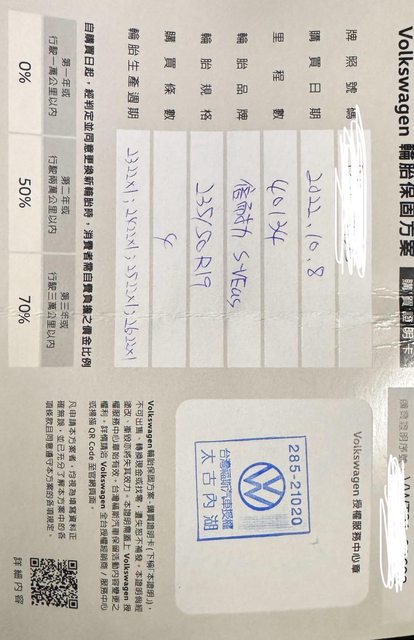 4. 輪胎2022/10/8 ,4萬公里時在內湖福斯換的,有三年保固,但保故方式我也不是很清
