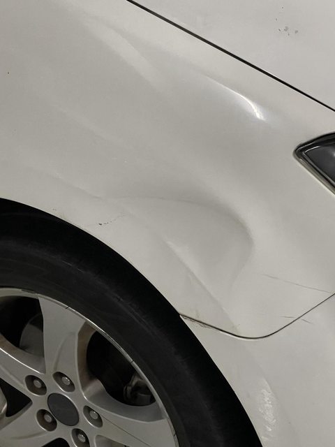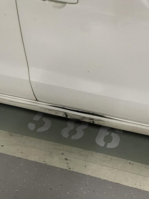 右側車頭停車庫被撞凹痕,右側側群自己撞到花盆。