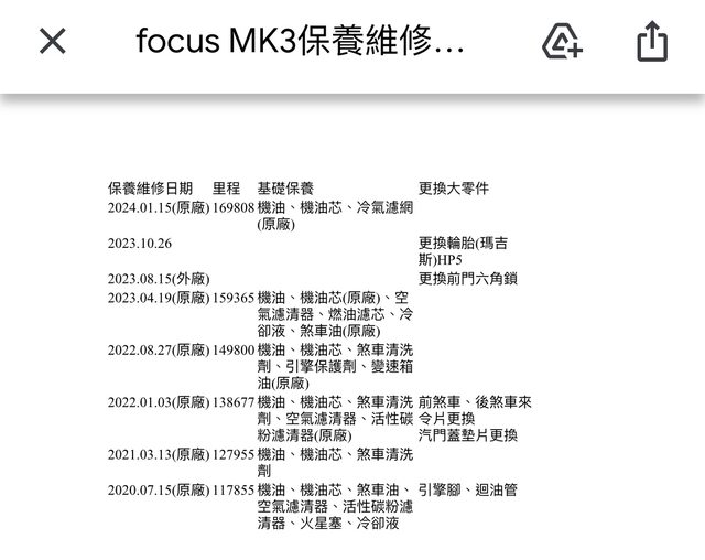約每1萬公里保養檢測一次,可附福特原廠app 保養紀錄佐證。有稍整理近4年保養紀錄如