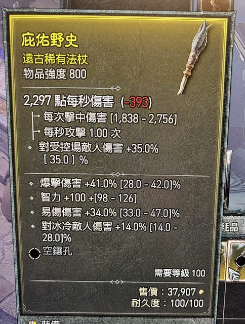 物 品:法杖,爆傷41%、智力+100、易傷34%、冰冷傷14%