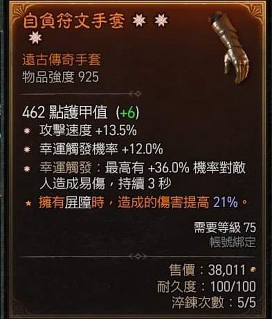 : 物 品:三遠古洪荒手套 幸運觸發 觸發易傷 攻速