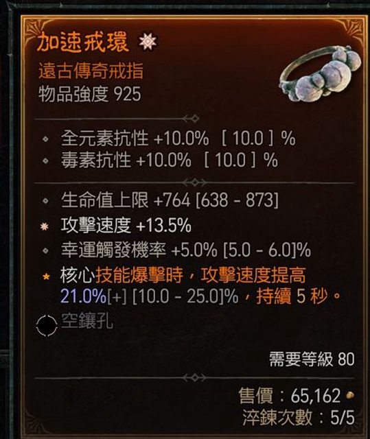 物 品:太古攻速 幸運5 毒抗 戒指