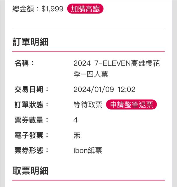 標題[售票] 3/22高雄櫻花季四人套票