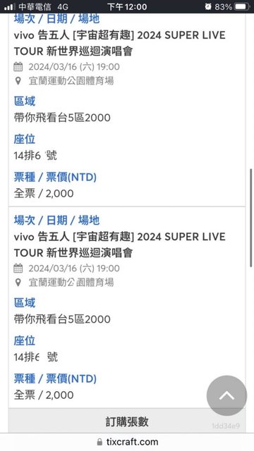 標題[售票] 3/16 告五人看台五區 門票?2
