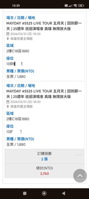 標題[售票] 五月天 3/31 C18區,1880*2