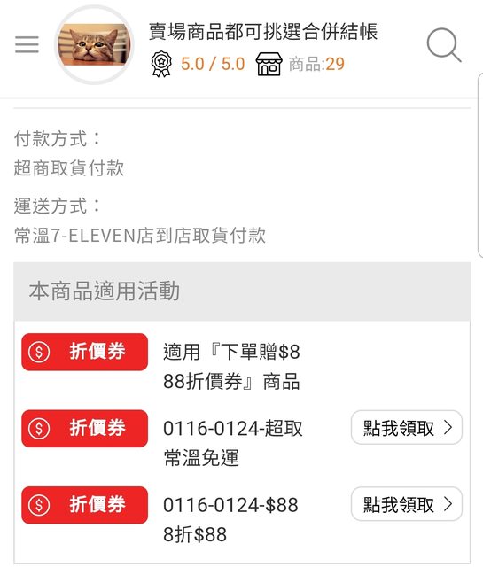 使用7-11 OP會員結帳前領取全站折價券及免運券(折價券使用期限01/16至01/24)