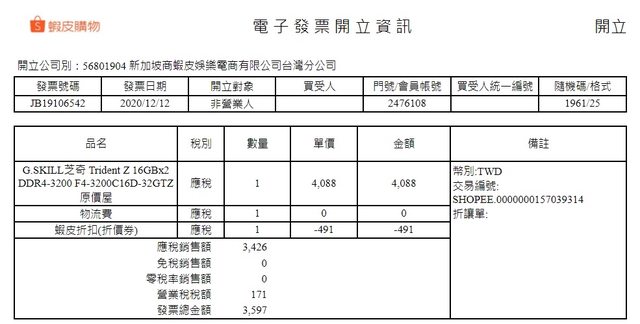 ※記憶體 : 2020/12/12購自原價屋(蝦皮商城),終身保固