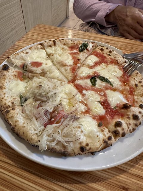 抵達富良野起司工廠,先讓爸媽參觀起司工房,我先去披薩工房排隊點餐。點完餐到