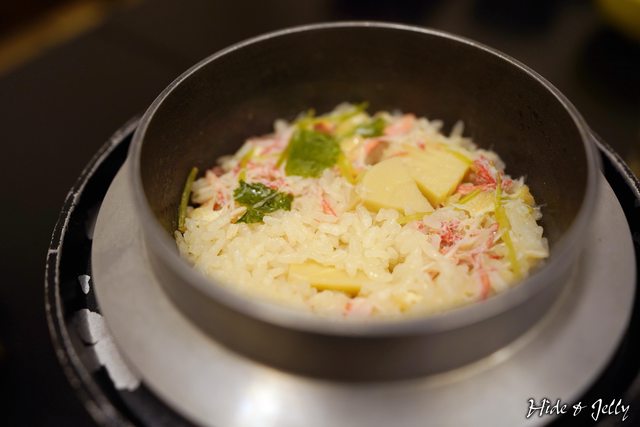 宴席料理最後填飽肚子的飯類,則是「蟹の釜飯」。加入蟹身肉、筍子與野菜的釜飯,上