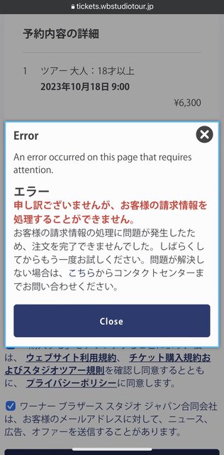 請教各位大大,我預計10/18想去哈利波特影城,看了klook跟kkday都沒有早上的時段,後來看官網還有九點的票可以買,但是不知道為什麼我填完資料後一直都是顯示這個畫面,不知道是哪個環節做錯了,所以上來請教一下,感謝解答