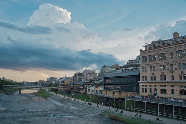 鴨川兩側,許多人在店家的納涼床上談天,或是坐在河畔吹風