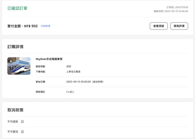 7. 其他說明:因使用當天 Skyliner 有狀況停駛,改搭 NEX,沒用到故售出。