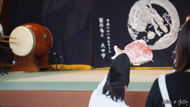 這時,一位神官打扮的工作人員,在台前舉起了一隻鯛魚,這就是惠比壽的目標啊。