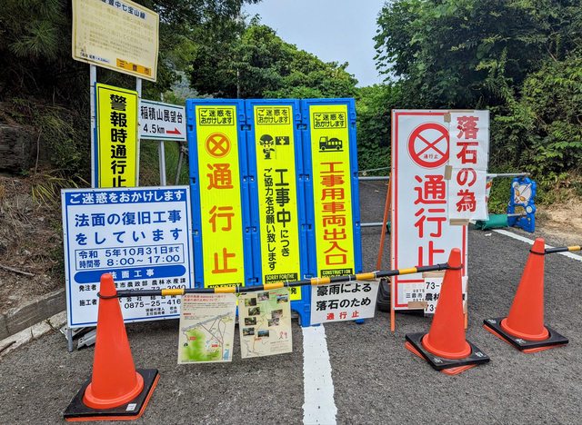 先前因為豪雨的關係,導致通往高屋神社本宮駐車場的道路上有落石的情形,公告禁止通行
