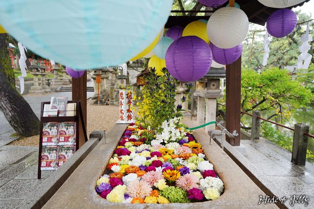 誕生石一旁,有一處很美的「花手水鉢」,放滿菊花的水鉢,還有許多各種顏色的和紙燈