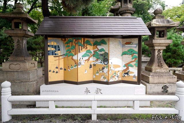 參道入口的右邊,可以看到由證券公司奉獻的屏風圖石碑,屏風的原圖是收藏在「靜嘉堂