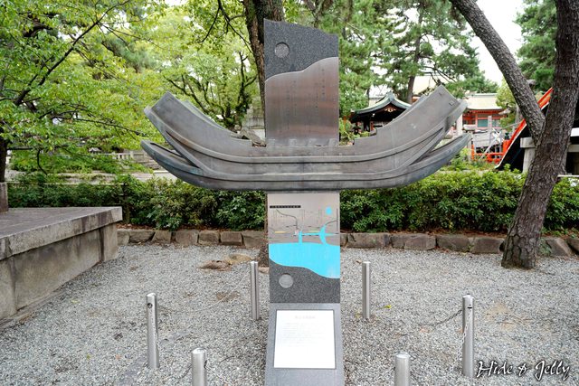 參道左側的「住吉万葉歌碑」,上方是北前船的造型,下方則是推論万葉時期住吉浜的海