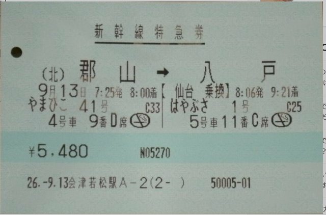 新幹線指定券1張(仙台-新青森,因はやぶさ全程指定席)指示位子用