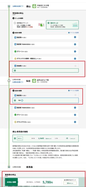 新幹線指定券2張(郡山-仙台、仙台-新青森)指示位子用