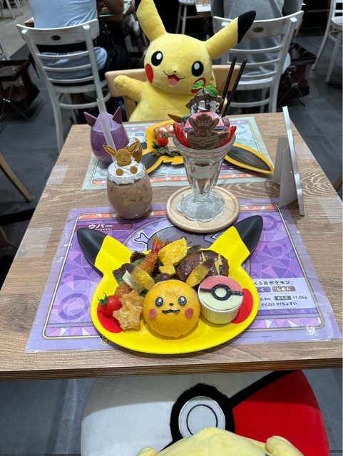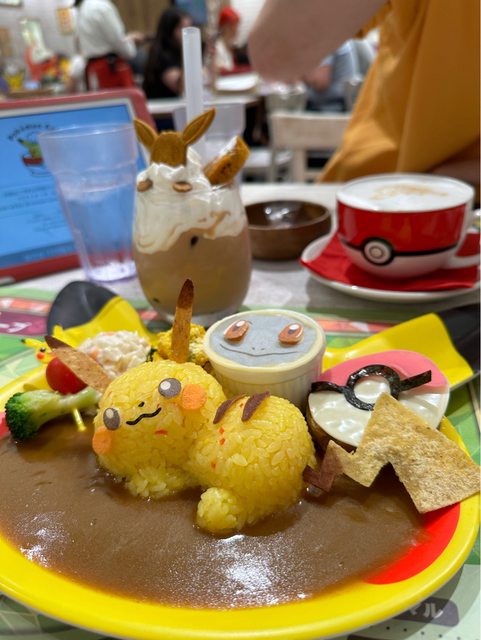 我們點了皮卡丘咖哩飯,卡比獸雞排飯,伊布奶茶,寶可夢拿鐵,這樣7150日幣。