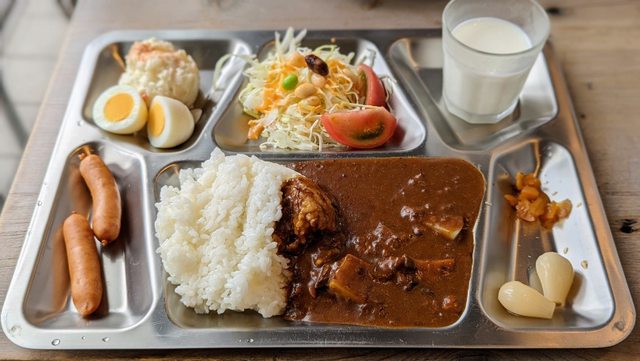 咖哩飯是用六格的餐盤裝,很像軍營裡使用的鐵盤,餐盤的質感很好,用餐盤吃比較有體