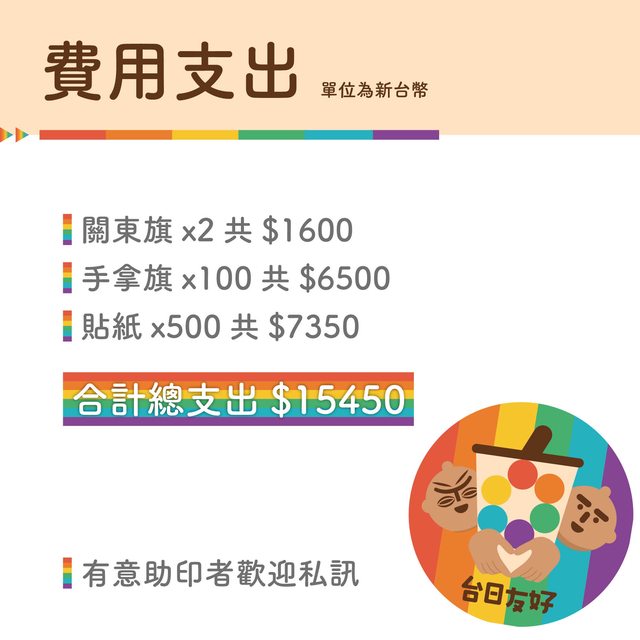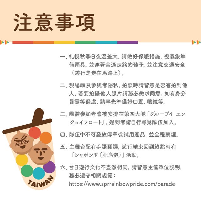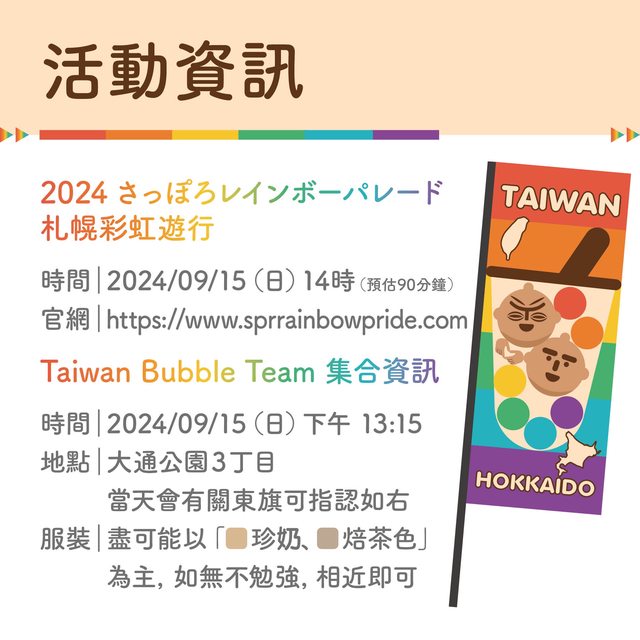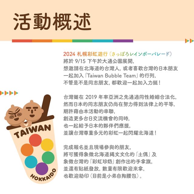 的夥伴們應援,並讓台灣尊重多元的彩虹一起閃耀北海道!